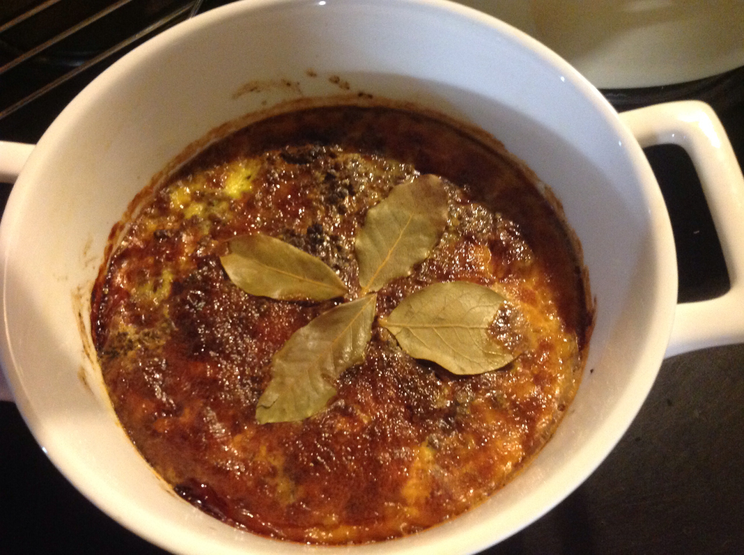 Cover with savoury custard and place 4 bay leaves on top.