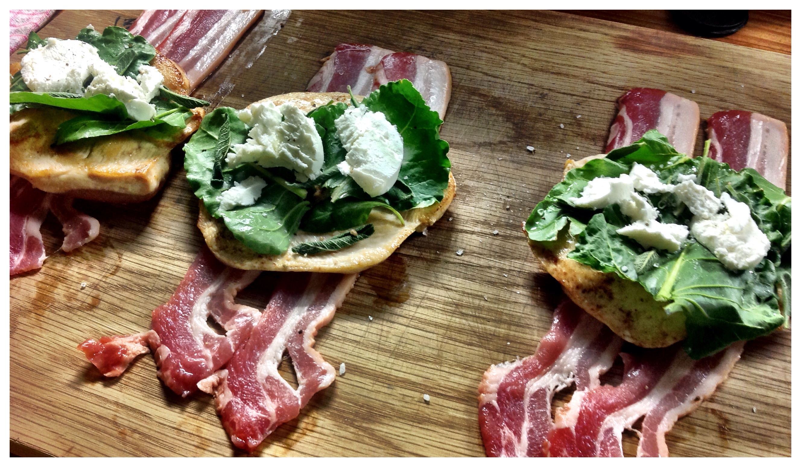 Place spinach leaves, sage & goats cheese on the cooked inside and season with salt. Wrap in bacon and secure with a toothpick.