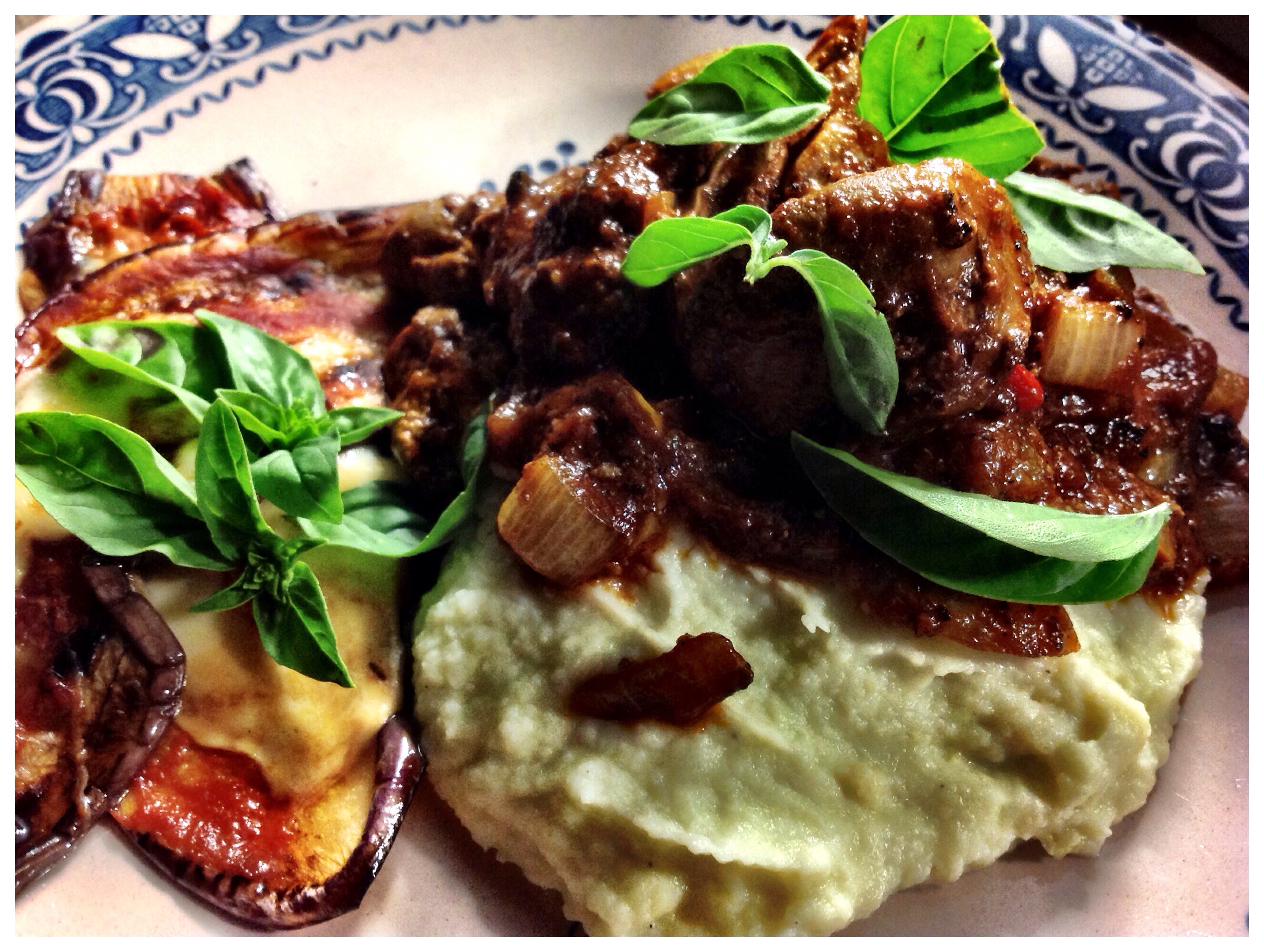 Serve the chicken livers on top of the ‘mash’ and scatter some torn fresh basil on top. {We also had some leftover ‘pizzas’ from the afternoon’s lunch.}
