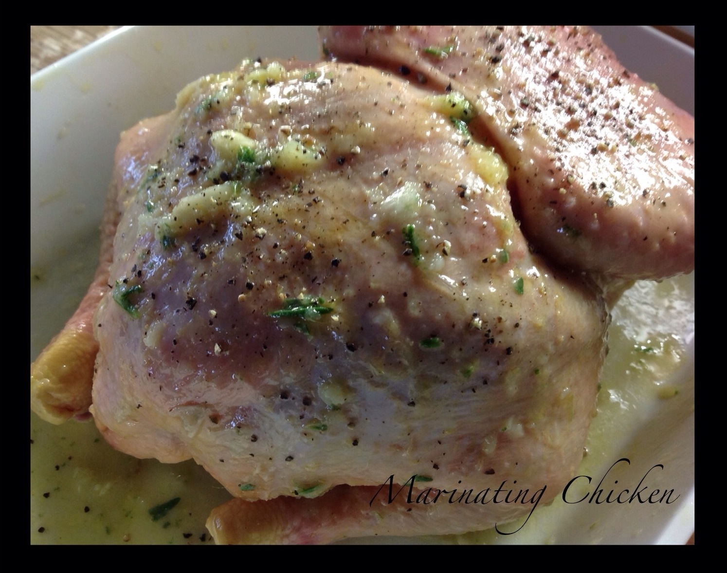 Halve the lemon and use the juice of one half for the ‘marinade’. Place the other half of the lemon inside the chicken.