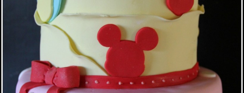 A double-tiered birthday cake featuring Minnie & Mickey Mouse – vanilla sponge; one layer rainbow and one layer with rainbow polka dots inside.