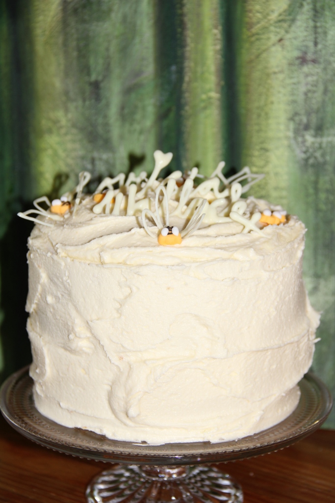 This is a vanilla sponge with honey buttercream and a custom white chocolate birthday message, along with some fondant honey bees.